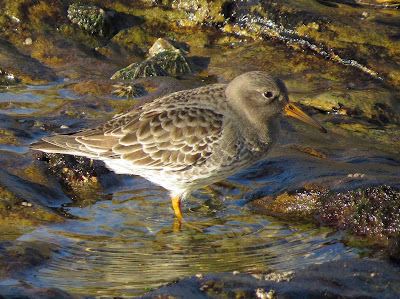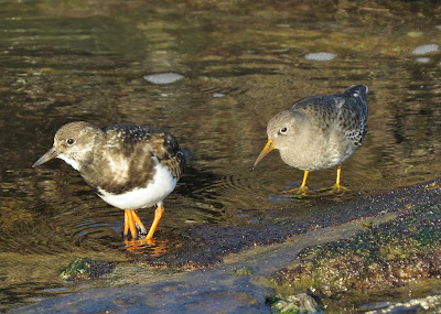 No tardaron en aparecer; dos ejemplares de este limícola marino comenzaron a alimentarse delante de nosotros, sin importarles en absoluto nuestra presencia. Estaban asociados a un grupo de Vuelvepiedras (que serían una docena) y un Correlimos Tridáctilo, también muy agradecido: